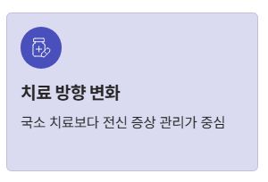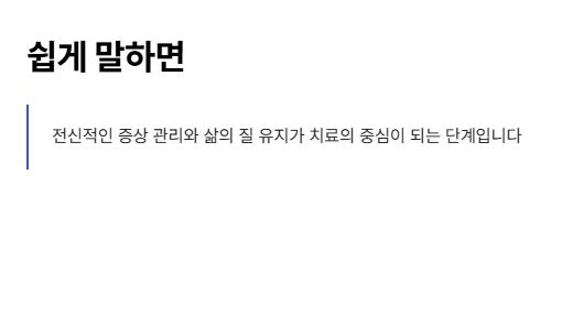 쉽게 말하면, 국소 치료보다는 전신적인 증상 관리와 삶의 질 유지가 치료의 중심이 되는 단계입니다.