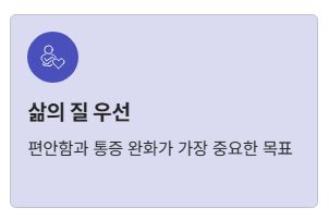 정리하면, 이 시기에는 치료의 목적이 병을 없애는 것보다 고통을 줄이고 편안함을 유지하는 것으로 바뀌게 됩니다.