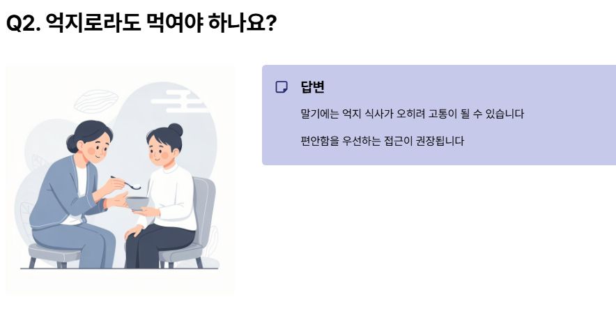 A. 말기에는 억지 식사가 오히려 고통이 될 수 있어, 편안함을 우선하는 접근이 권장됩니다.