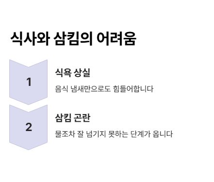 음식 냄새만으로도 힘들어하고, 물조차 잘 넘기지 못하는 단계가 올 수 있습니다.