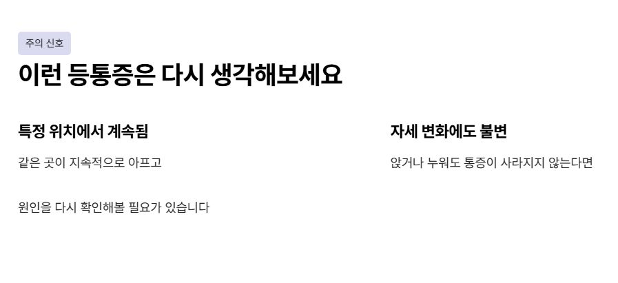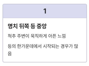 등의 한가운데, 척추 주변이 묵직하게 아픈 느낌으로 시작되는 경우가 많습니다.