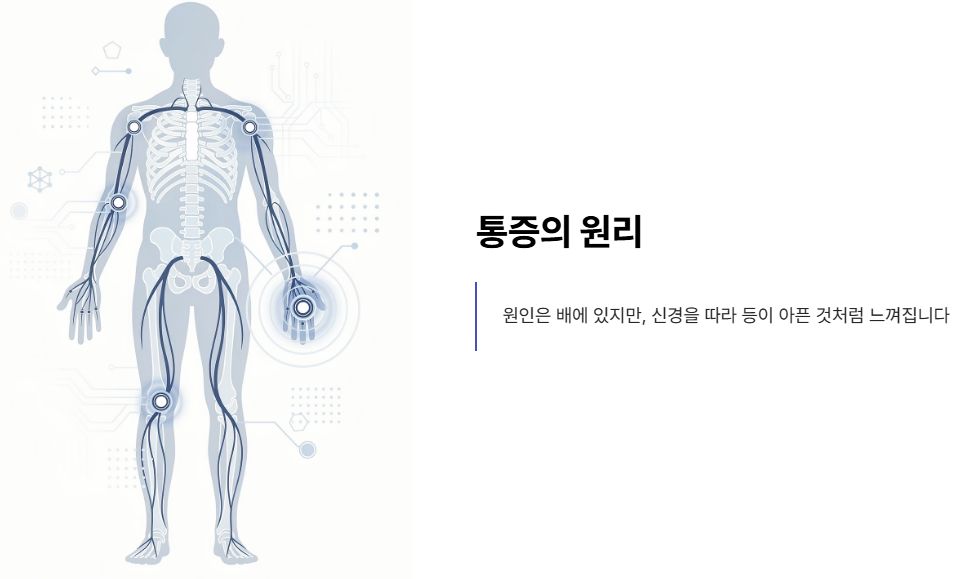 쉽게 말하면, 통증의 원인은 배에 있지만 신경을 따라 등이 아픈 것처럼 느껴지는 것입니다.