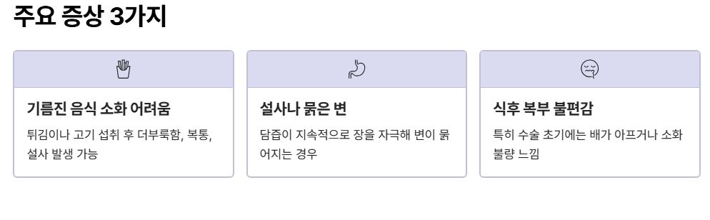 쓸개를 제거하면 담즙이 저장되지 않고 간에서 바로 장으로 조금씩 흘러가게 됩니다. 이 때문에 다음과 같은 변화가 나타날 수 있습니다.